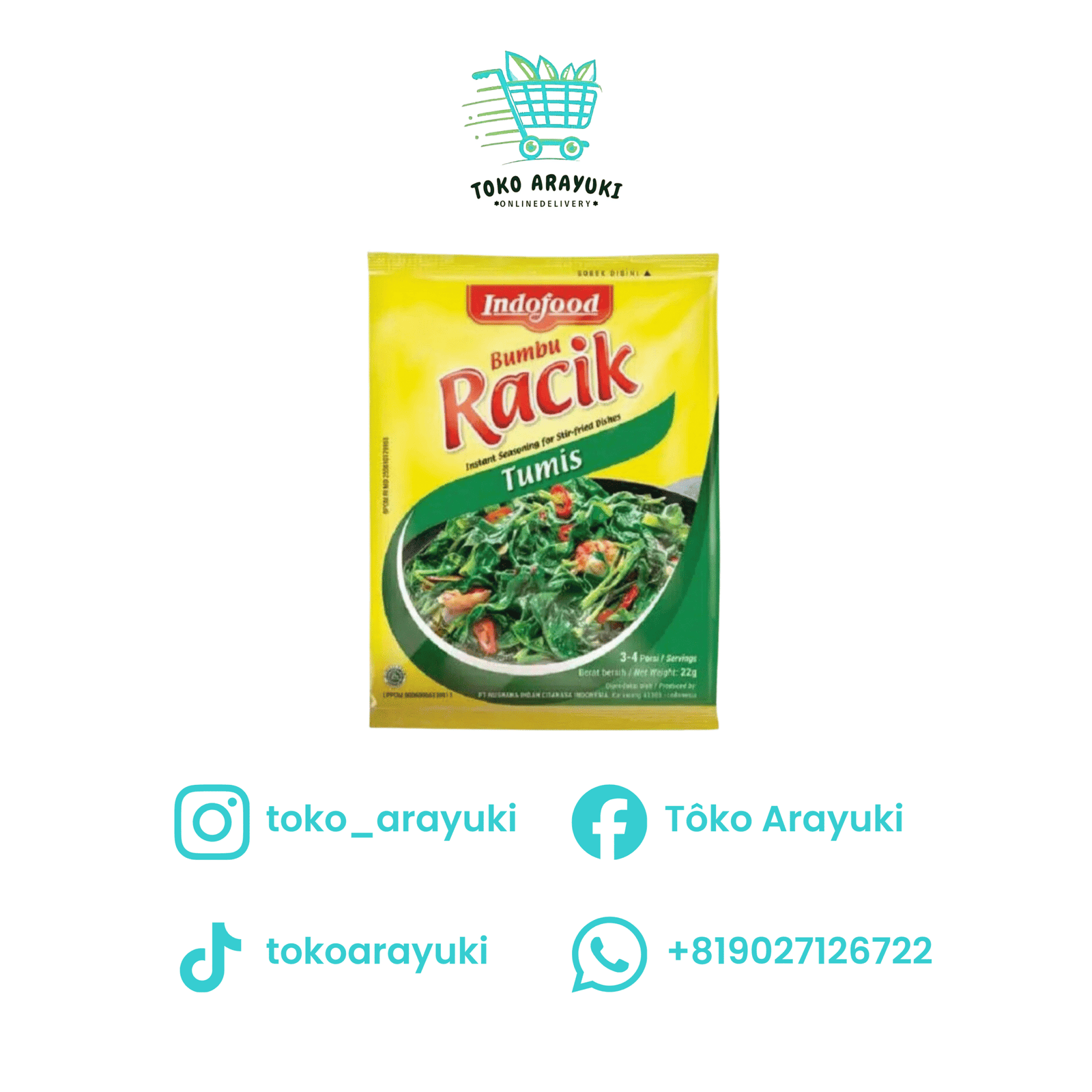 Bumbu Racik Tumis adalah bumbu instan siap pakai dari Indofood yang dirancang untuk mempermudah proses menumis sayuran atau daging. Bumbu ini sudah mengandung racikan rempah-rempah alami seperti lengkuas dan daun salam, tanpa pengawet atau pewarna buatan, sehingga dapat menyajikan masakan tumis lezat secara praktis.