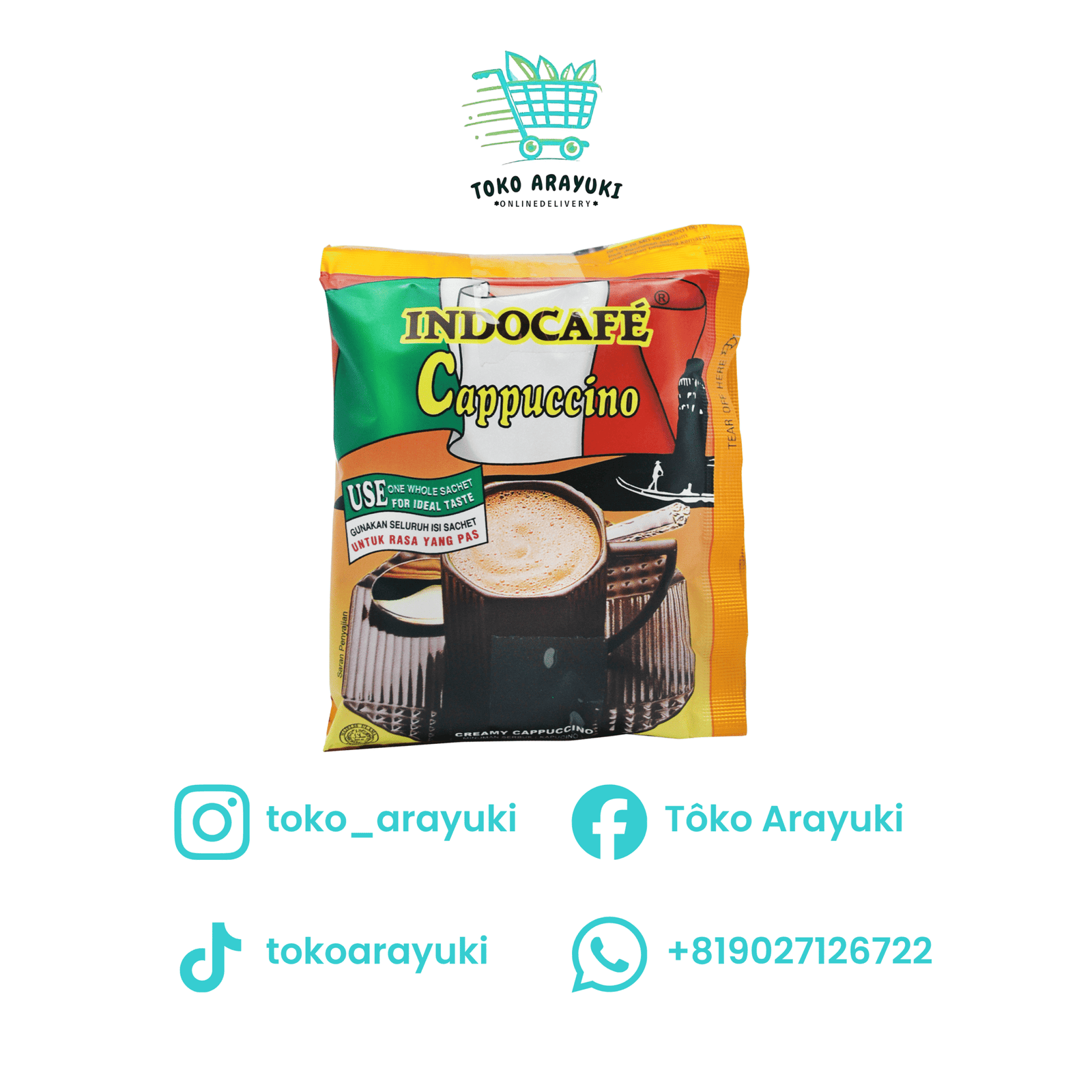 Indocafe Cappuccino adalah kopi instan dalam bentuk serbuk yang dirancang untuk memberikan rasa dan aroma cappuccino ala kafe. Produk ini merupakan campuran kopi, gula, krimer, dan susu bubuk skim dengan tambahan choco granule yang menciptakan rasa creamy dan busa lembut khas cappuccino. Sangat praktis, hanya perlu diseduh dengan air panas, dan sudah mengandung pemanis sehingga tidak perlu menambahkan gula.