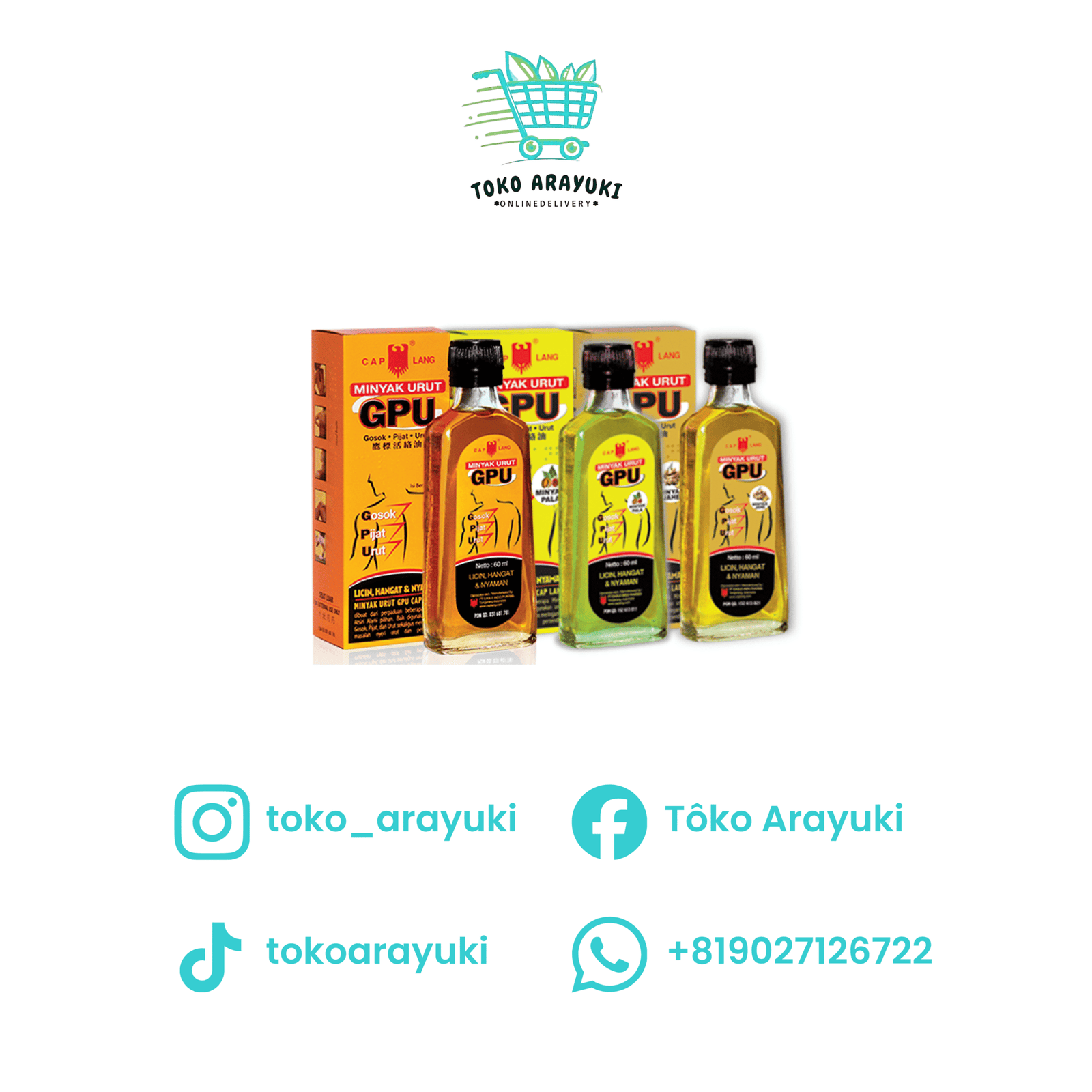 GPU Minyak Urut Pala Cap Lang untuk mengurangi nyeri sendi, nyeri otot, sakit punggung, keseleo, memar akibat benturan, dapat memperlancar aliran darah, dan dapat digunakan sebagai minyak untuk memijat.